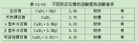 9)由于粉磨溫度下降的較多,會影響到天然石膏的脫水,會影響到水泥的凝結時間和早期強度,這在水泥質量上要給予關注。石膏有多種形態,它們的溶解度和溶解速率各不相同,勢必影響到水泥水化早期、水泥顆粒表面鈣礬石晶體的形成,繼而影響到水泥的流變性和需水量。不過也有例外,粉磨溫度的變化對脫硫石膏的溶解影響不大。石膏的形態通常有生石膏(CaSO4·2H2O)、天然硬石膏(CaSO4)、半水石膏(CaS O4·1/2H2O)、可溶性硬石膏(CaSO4),其溶解度和溶解速率是不同的,詳見表02-05。粉磨溫度的變化會影響石膏的脫水程度,繼而影響到其溶解度和溶解速率。