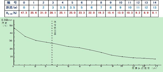 把每個取樣點取得的試樣混合均勻后,作為該取樣點的平均試樣并編好號,防止搞錯,用0.08mm篩分別進行篩析,測得各段的篩余百分數;然后以縱坐標為測出的篩余%(細度),橫坐標為取樣點離磨頭的距離(m),把篩析數據,標記在坐標圖上、聯線,即為磨內篩析曲線。