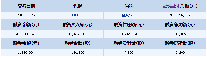 冀東水泥(000401)2016-11-17融資融券信息顯示,冀東水泥融資余額373,455,675元,融券余額1,670,994元,融資買(mǎi)入額11,679,901元,融資償還額11,364,872元,融資凈買(mǎi)額315,029元,融券余量144,300股,融券賣(mài)出量7,600股,融券償還量2,200股,融資融券余額375,126,669元。冀東水泥融資融券詳細(xì)信息如下表: