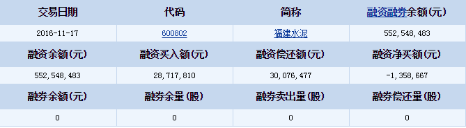 福建水泥(600802)2016-11-17融資融券信息顯示,福建水泥融資余額552,548,483元,融券余額0元,融資買入額28,717,810元,融資償還額30,076,477元,融資凈買額-1,358,667元,融券余量0股,融券賣出量0股,融券償還量0股,融資融券余額552,548,483元。福建水泥融資融券詳細(xì)信息如下表: