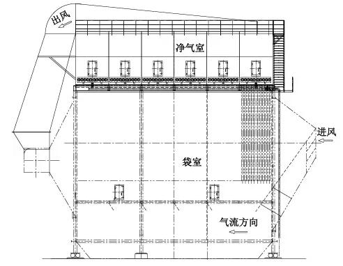 根據參數要求,窯尾除塵器電改袋時,原有電除塵器空間緊湊,水平截面較小,且寬度也較窄。風量提高后,若按照常規的袋除塵器改造方式,需在設備殼體內部設置出風風道,這樣要使改造后的袋除塵器滿足合理的過濾參數,就會使濾袋間距很小,出風風道也較窄,這給整個收塵系統的穩定低阻工作帶來很多不穩定因素。