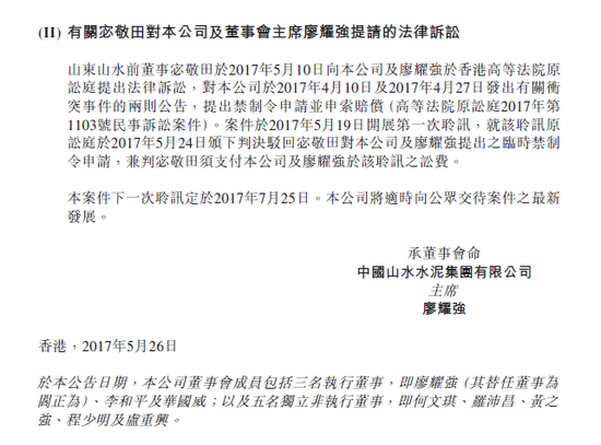 公告指出,山東山水董事、總經理楊勇正和本公司聯席公司秘書、山東山水總經理助理喻春良是本集團的高管并依法執行于山東山水總部的接管收回行動。宓敬田對本公司及董事會主席廖耀強提請的法律訴訟,本案件下一次聆訊定于2017年7月25日。