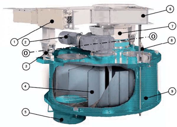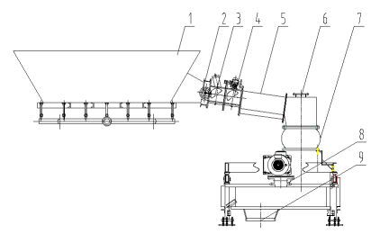 6、轉接溜子 7、進口軟連接 8、輪輻轉子計量裝置 9、下料接口