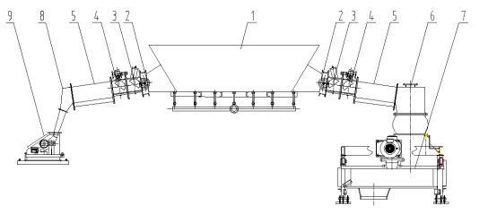 5、布風斜槽 6、轉接溜子 7、輪輻轉子計量裝置 8、下料溜子 9、固體流量計