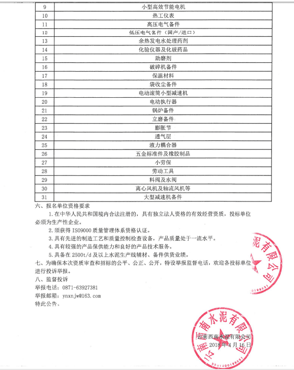 云南西南水泥2018年度第二批輔材備件集中采購招標公告