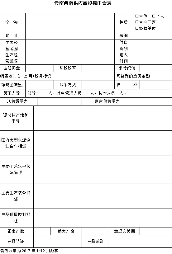 【水泥人網】云南西南水泥有限公司(以下簡稱云南西南)成立于2012年3月,注冊資本金20億元,總部設于云南省昆明市呈貢新區,下屬成員企業19家,遍布云南省昆明、曲靖、普洱、麗江、文山、德宏等市州及四川省攀枝花市,現擁有代表國內先進水平的日產熟料5000噸、4000噸、3200噸、2500噸等新型干法水泥生產線26條,水泥年產能逾2300萬噸,規模位居全省水泥企業第二位。云南西南目前資產總額達145億元,擁有干部員工3900余人。云南西南秉承“善用資源、服務建設”的核心理念和“創新、績效、和諧、責任”的核心價值觀,努力創建“創新績效型、資源節約型、環境友好型、社會責任型”的“四型企業”,著力發展成為云南省水泥行業規模領先、技術先進、管理優秀、效益一流的專業化水泥企業。為了做好云南西南下屬19家成員企業2017年度生產用第二批輔材備件集中采購的招議標工作,誠邀云南西南下屬19家成員企業的機電設備原制造供貨廠及其它同類制造企業參加,以滿足云南西南下屬成員企業生產的機電設備備件及輔助材料的需求,共同打造云南西南長期穩定合作、互惠共贏的供應商渠道。現將相關招標采購信息發布如下: