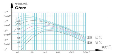 電除塵器工作適宜的粉塵比電阻范圍是10^4-10^11Ω.cm,而窯頭余熱利用鍋爐投運之后,煙氣溫度從200℃以上降至90~130℃,粉塵比電阻從<10^11Ω·cm上升到>10^12Ω·cm,如附圖,煙氣溫度在90~130℃范圍內,粉塵比電阻正處于極大值附近,只有適當增加煙氣中的濕度,使得粉塵比電阻降低到合適的范圍,除塵效率才能相應提高。