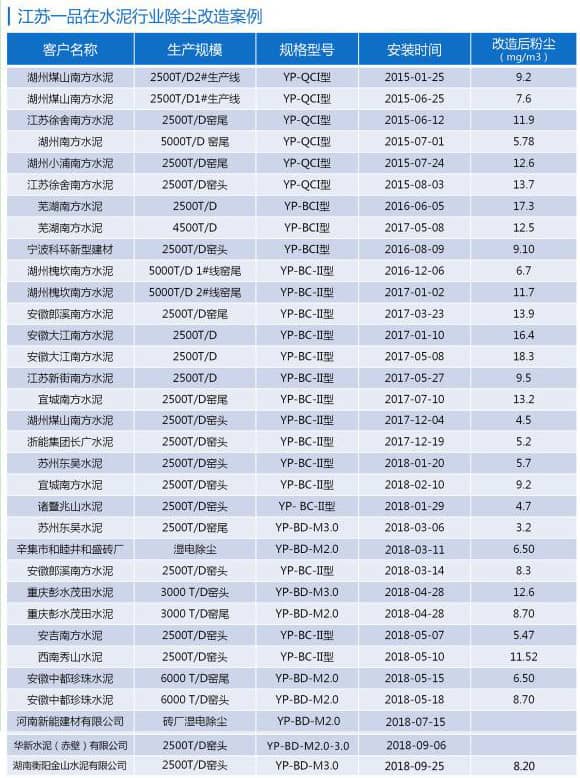 目前,該套電除塵超低排放改造技術和方案,已由江蘇一品環保在90余條水泥生產線上應用和驗證,均獲得了非常顯著的效果。實踐證明,水泥行業原有的電除塵器,只要能確保除塵器本體各項工況完好,并對電場內部加以技術改造,配合生產工藝的嚴格把控,選擇合適先進的除塵電源,使粉塵達到超低排放,完全可以實現!