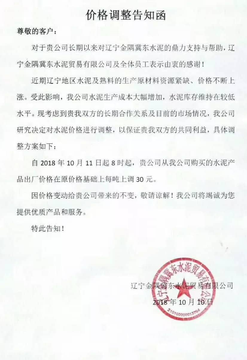 繼華北、西南、華南、華中地區水泥價格紛紛上調后,遼寧地區水泥價格迎來上漲。 遼寧金隅冀東水泥貿易有限公司發布價格調整函稱,近期遼寧地區水泥及熟料的生產原材料資源緊缺、價格不斷上漲??紤]到目前市場情況,公司研究決定自2018年10月11日8時起,水泥產品出廠價格在原價格基礎上每噸上調30元。 漲價函如下: