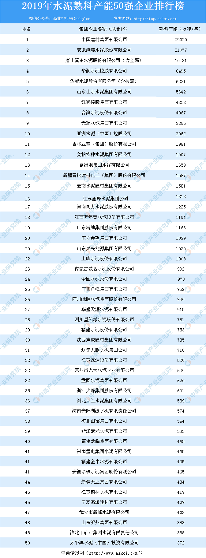據(jù)數(shù)據(jù)統(tǒng)計顯示:前10家大企業(yè)集團(tuán)的水泥熟料年產(chǎn)能達(dá)到10.3億噸,占全國總產(chǎn)能的57%,與上年相比保持持平。以下是2019年全國水泥熟料產(chǎn)能50強(qiáng)企業(yè)詳細(xì)排名情況: