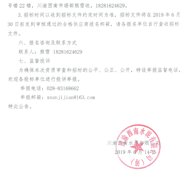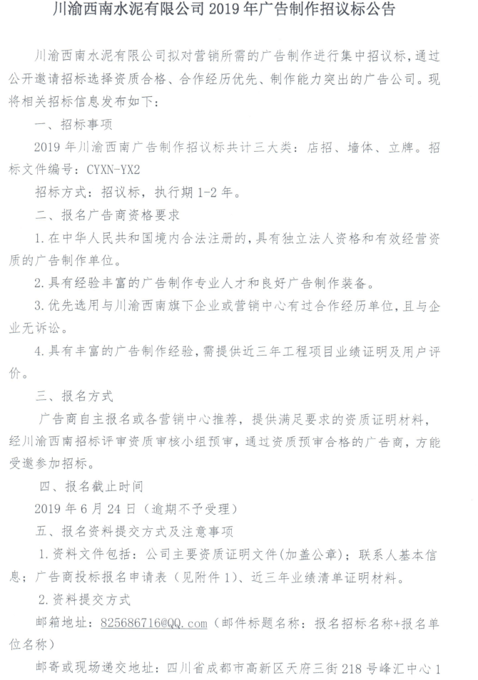 川渝西南水泥有限公司擬對營銷所需的廣告制作進行集中招議標,通過公開邀請招標選擇資質合格、合作經歷優先、制作能力突出的廣告公司。現將相關招標信息發布如下: