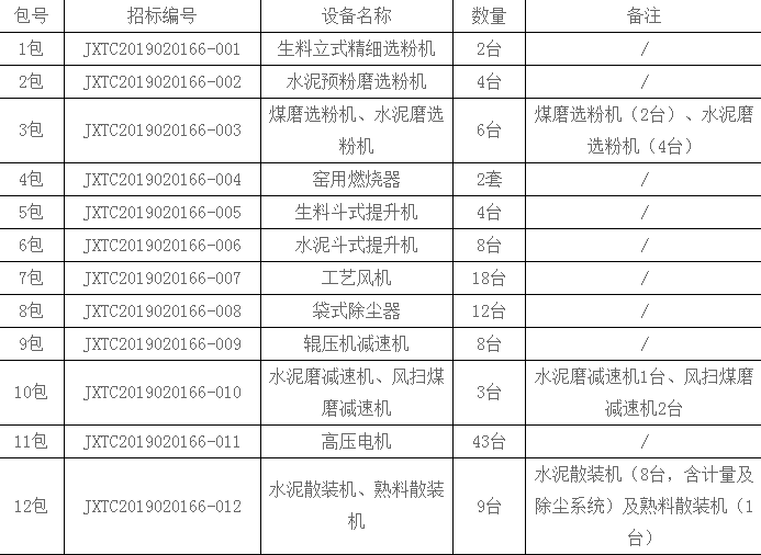 包2、包8、包10:近十年(2009年1月1日以來)內投標人在中國大陸至少有兩個生產能力4000噸/天及以上熟料水泥生產線或年產100萬噸及以上水泥粉磨站同類設備供貨業績(含改造項目)。