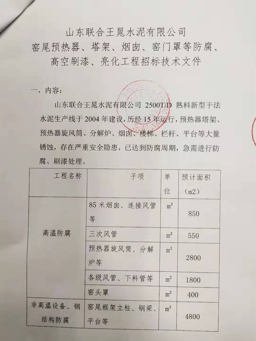 據(jù)水泥人網(wǎng)消息,近日山東聯(lián)合王晁水泥有限公司委托水泥人網(wǎng)針對(duì)窯尾預(yù)熱器、塔架、煙囪、窯門罩等防腐、高空刷漆、亮化工程招標(biāo)。