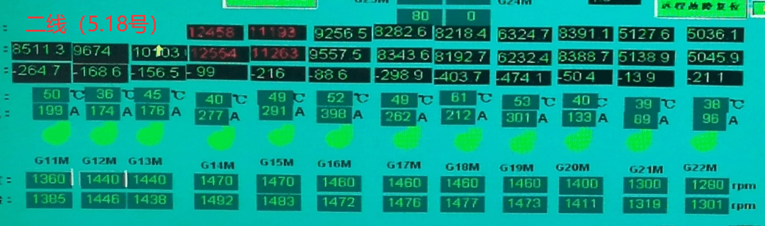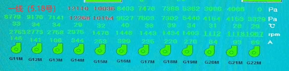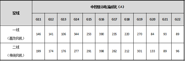 對比當天兩條線12臺篦冷風機運行電流可見,在一線熟料產量高于二線的前提下,一線僅有G14風機實際運行電流明顯高于二線(設計全壓比二線高1000Pa),G18、G21兩臺風機電流稍高,但在波動范圍內,其余9臺風機運行電流均比二線對應風機電流低。中控顯示12臺風機運行電流一線篦冷風機較二線篦冷風機低230A以上。