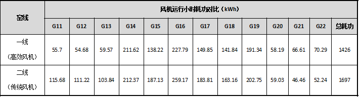 工程技術人員在窯線正常運行工況下分別對兩條線篦冷風機實際運行耗功進行了測算,結果見下表: