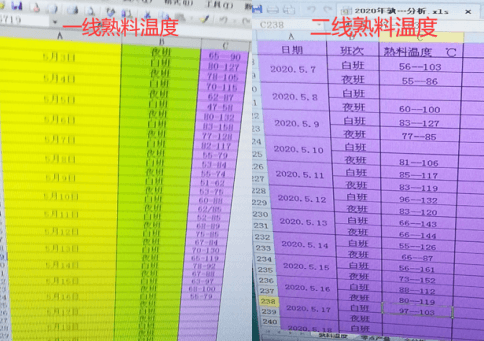 除了對比兩條線風機運行能耗,工程技術人員還對比了5月份兩條線正常運行后在相同位置測得的熟料溫度,一線熟料溫度大約50-90℃,二線熟料溫度大約60-120℃,一線熟料溫度明顯低于二線孰料溫度,可見一線冷卻效果好于二線,見下圖。