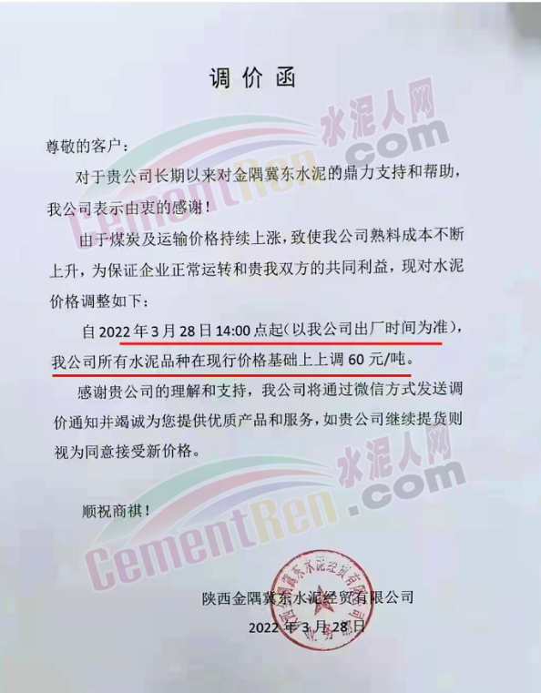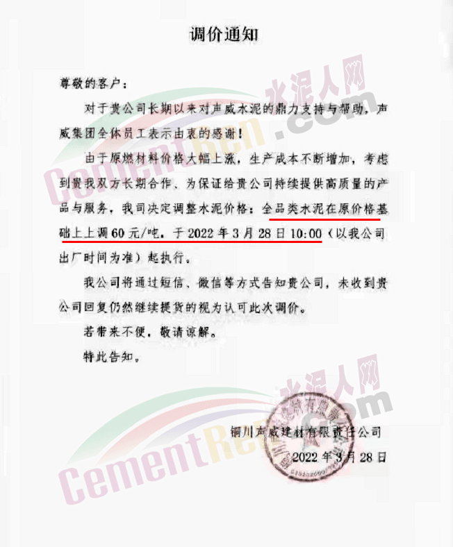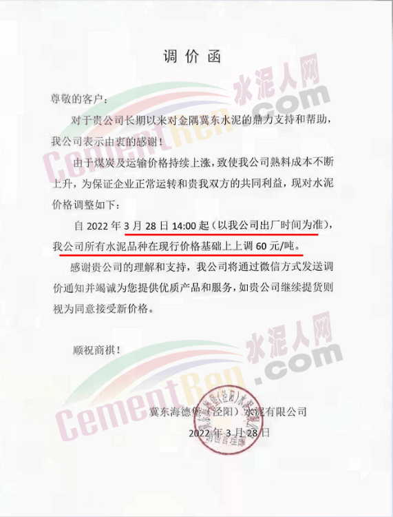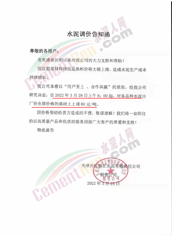 天津天旺崇正水泥有限責(zé)任公司銷售公司水泥調(diào)價(jià)告知函稱,因近期原材料特別是熟料價(jià)格大幅上漲,造成水泥生產(chǎn)成本持續(xù)增長,經(jīng)公司研究決定自3月28日上午8時(shí)起,對各品種水泥出廠價(jià)上調(diào)80元/噸。