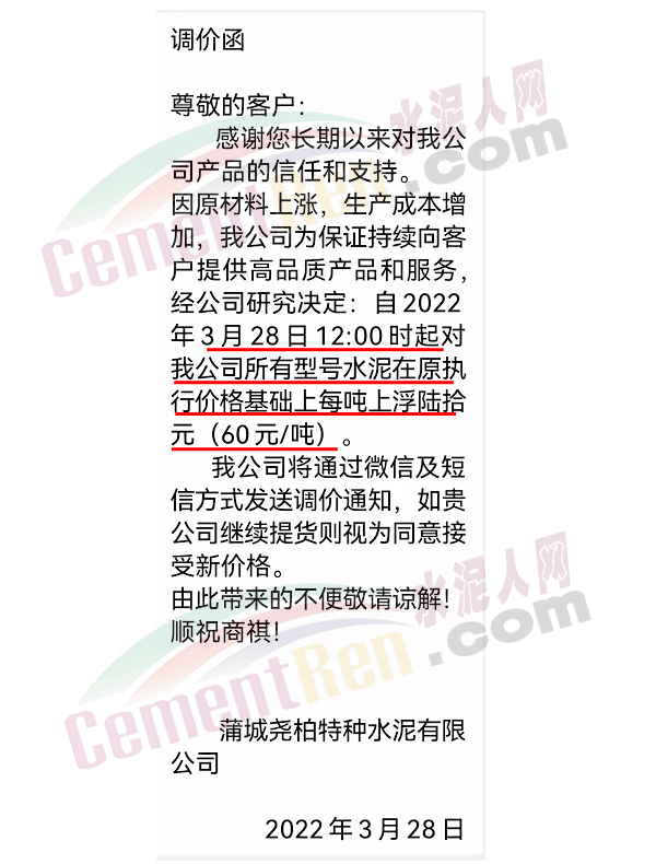 蒲城堯柏特種水泥通知,3月28日12時(shí)起,所有型號水泥上漲60元/噸。