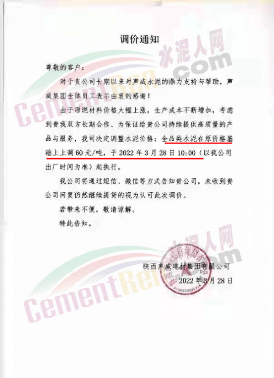 陜西聲威建材集團(tuán)有限公司發(fā)調(diào)價(jià)通知稱,由于原燃材料價(jià)格大幅上漲,生產(chǎn)成本不斷增加,公司決定全品類水泥自3月28日10時(shí)起上調(diào)60元/噸,銅川聲威建材同步上調(diào)60元/噸。