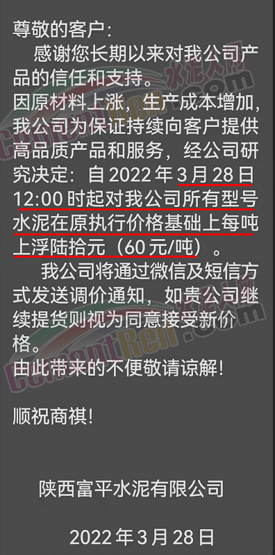 陜西富平水泥有限公司通知,3月28日12時(shí)起,所有型號水泥上浮60元/噸。