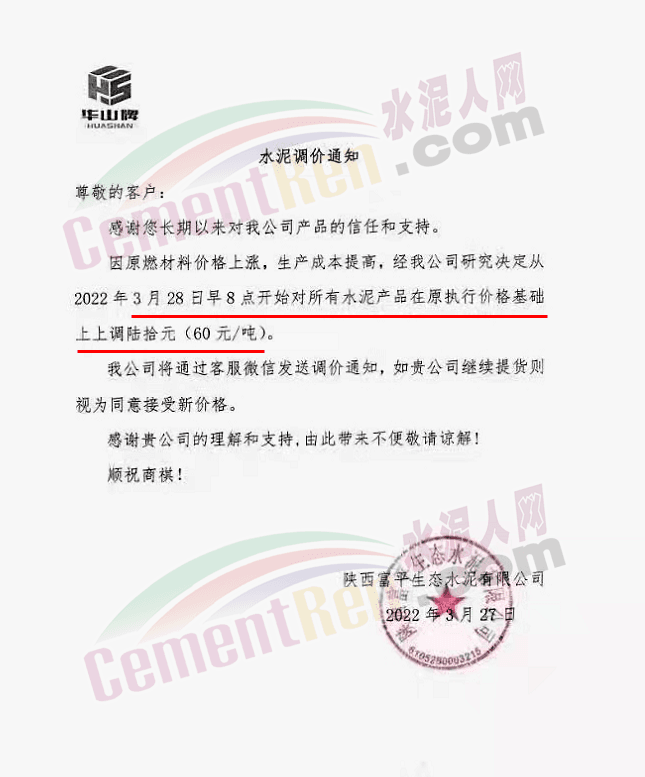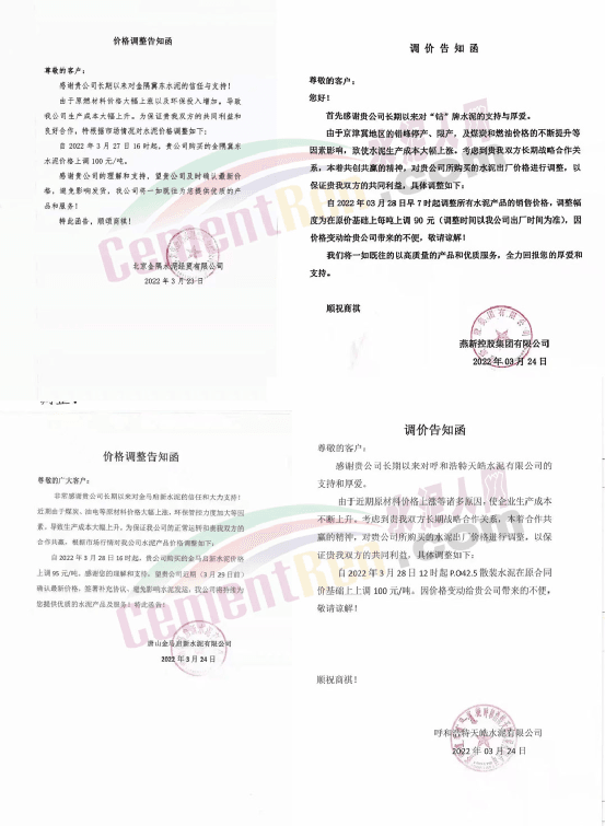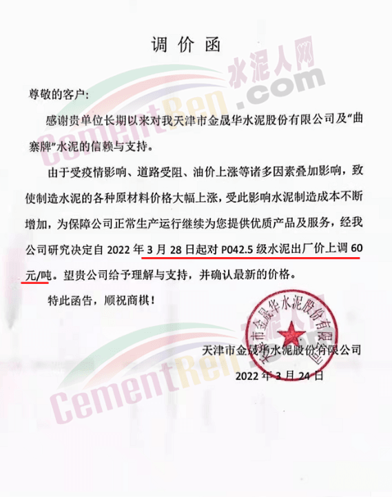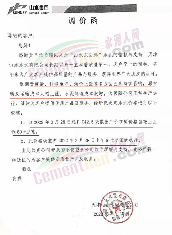 天津山水水泥有限公司調(diào)價(jià)函稱,近期受疫情、錯峰生產(chǎn)、油價(jià)上漲等多方面因素持續(xù)影響,原材料及運(yùn)輸成本大幅上漲,水泥制造成本激增。為保障公司正常生產(chǎn)運(yùn)行,繼續(xù)為客戶提供優(yōu)質(zhì)產(chǎn)品及服務(wù),經(jīng)廠家決定水泥價(jià)格自3月28日上午8時(shí)起P.O42.5散裝水泥上調(diào)60元/噸。
