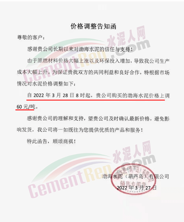 渤海水泥(葫蘆島)有限公司通知,3月28日8時(shí)起,渤海水泥價(jià)格上調(diào)60元/噸。