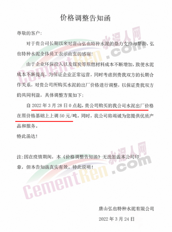 唐山弘也特種水泥通知自3月28日0時(shí)起,水泥價(jià)格上調(diào)50元/噸。