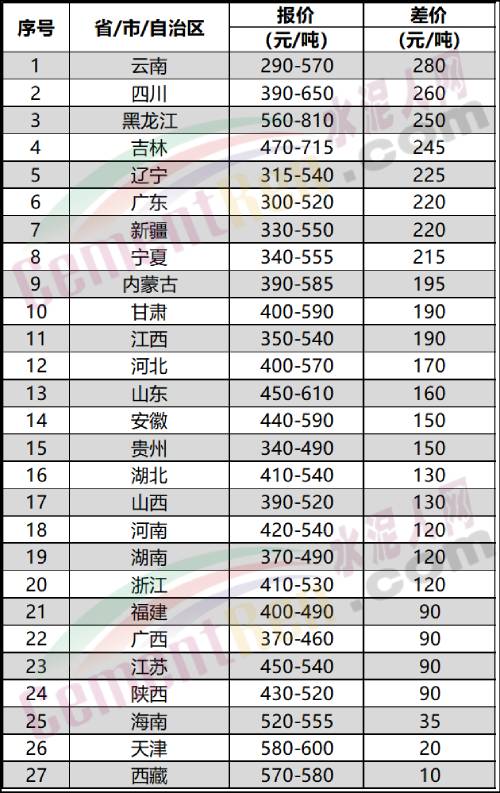 綜合600多家企業(yè)數(shù)據(jù),27個(gè)省市自治區(qū)內(nèi)均有不同幅度的價(jià)差,價(jià)差在200元/噸以上的分別是云南、四川、黑龍江、吉林、遼寧、廣東、新疆、寧夏等8個(gè)省自治區(qū),其中云南省內(nèi)不同區(qū)域間差價(jià)達(dá)280元/噸,其次是四川省內(nèi)差價(jià)260元/噸。