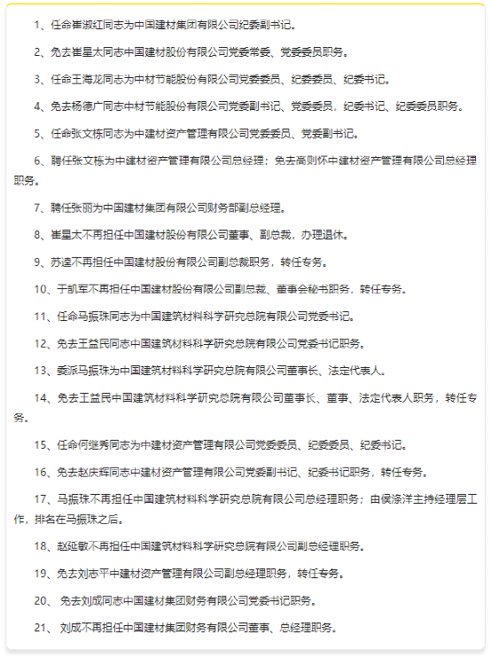 1月初,中國建材集團有限公司發布數十條高層任免通知,對中國建材部分高層職務進行了重新任免。
