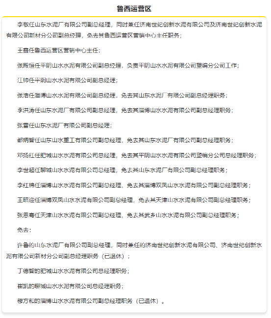 1月中旬,山東山水集團有限公司發布人事任命,對旗下多個運營區進行人事調整,涉及魯西、魯東、魯南、東北和山西等多個區域。