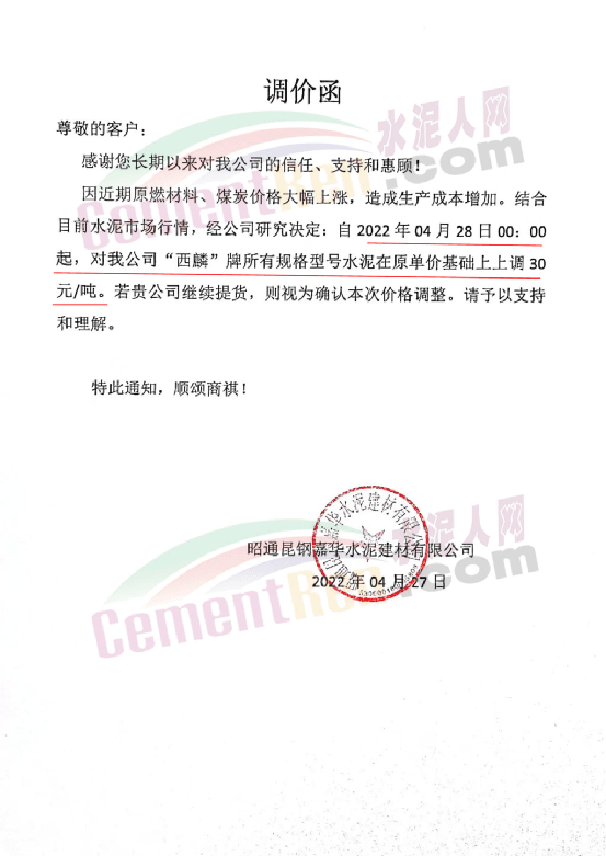 云南永保特種水泥有限責任公司通知,因各類水泥原材料的緊缺及價格上漲而導致生產成本的上升,故對水泥價格做出調整以緩解不斷上漲的成本壓力,自2022年4月30日0時起所有區域所有品種水泥在原價基礎上上調 30元/噸。