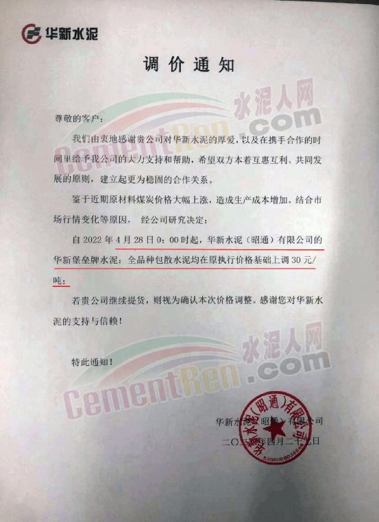 華新水泥(昭通)有限公司通知鑒于近期原材料煤炭價格大幅上漲,造成生產成本增加。結合市場行情變化等原因,經公司研究決定自年4月28日0時起,華新堡壘牌水泥全品種包散水泥均在原執行價格基礎上調30元/噸。