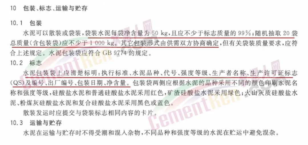 普通硅酸鹽水泥標準GB175-2007第10節明確,水泥可以散裝或袋裝,袋裝水泥每袋凈含量50kg,且應不少于標準質量的99%;隨機抽取20袋總質量(含包裝袋)應不少于1000kg。其它包裝形式由供需雙方協商確定,但有關袋裝質量要求,應會使上述規定。水泥包裝袋應符合GB9774的規定。