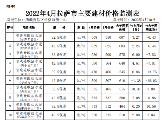 西藏自治區價格監測中心數據顯示,2022年4月各企業水泥價格較上年同期降多漲少。普通硅酸鹽水泥42.5水泥市場價下跌44元,跌幅6.44%。其中華新42.5強度水泥出廠價下跌110元/噸,幅度達到18.03%。