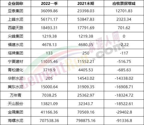 應收賬款及票據方面,天山股份、金隅集團、萬年青、寧夏建材、華新水泥、冀東水泥、尖峰集團、青松建化、上峰水泥、祁連山、福建水泥等企業2022年一季度較上看末期環比均有不同幅度的增加。