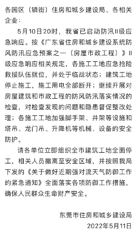 5月11日,東莞市住房和城鄉建設局官網發布《關于全市建筑工地全面停工的緊急通知》要求各單位立即組織全市建筑工地全面停工,相關人員撤離至安全區域,并按照《關于做好近期強對流天氣防御工作的緊急通知》全面落實各項防御工作措施,確保人民群眾生命財產安全。
