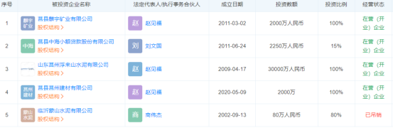 企業對外投資五家企業,其中莒縣麒宇礦業有限公司、莒縣中海小額貸款股份有限公司、山東莒州浮來山水泥有限公司、莒縣建材有限公司四家尚在正常營業。企業對莒縣麒宇礦業有限公司、山東莒州浮來山水泥有限公司、莒縣建材有限公司為100%控股,莒縣中海小額貸款股份有限公司持股15%。