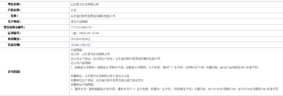 山東省市場監督管理局生產許可證數據顯示,山東莒州水泥有限公司生產許可證編號(魯)XK08-001-01566,生產許可證有效期至2023年5月28日 。生產許可證產品明細顯示企業擁有一條5000t/d熟料生產線和3條粉磨生產線。