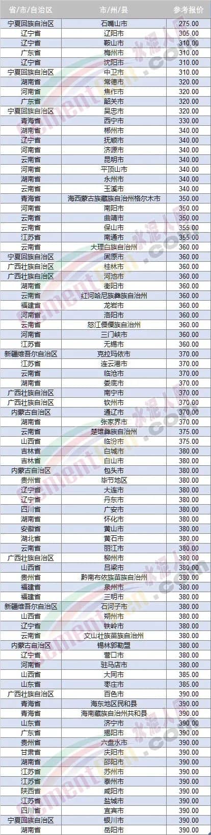 據(jù)水泥人網(wǎng)信息中心數(shù)據(jù),盡管多區(qū)域主要品牌企業(yè)報(bào)價(jià)大幅拉抬,但落地執(zhí)行價(jià)格仍相對(duì)較低,近期報(bào)價(jià)在400元/噸以下的區(qū)域包括寧夏、遼寧、廣東、河南、湖南、青海、云南、江蘇、福建、內(nèi)蒙、山西、四川、貴州、湖北、安徽、甘肅 、陜西等近二十個(gè)省份、自治區(qū)。寧夏石嘴山賽馬水泥P.O42.5散裝水泥參考報(bào)價(jià)已降至300元/噸以下,報(bào)275元/噸。