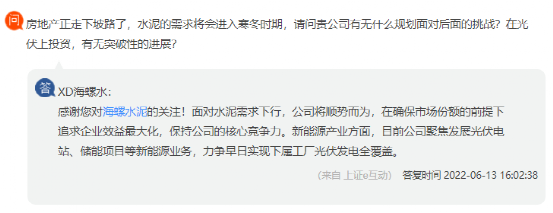 日前,有投資者在市公司平臺提問,房地產正走下坡路了,水泥的需求將會進入寒冬時期,請問貴公司有無什么規劃面對后面的挑戰?