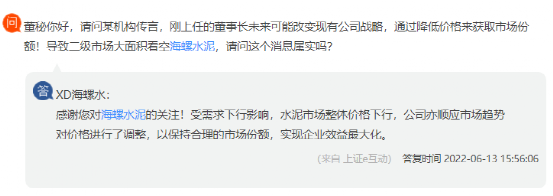 另有投資者提問,剛上任的董事長未來可能改變公司現有戰略,企業通過降低價格來獲取市場份額,導致二級市場大面積看空海螺水泥,是否屬實?