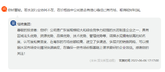 月初,塔牌水泥在回復投資者提問時表示,公司是廣東省規模較大和綜合競爭力較強的水泥制造企業之一,具有區域龍頭優勢、資源優勢、品牌優勢、技術優勢、管理優勢等,具有較高的知名度、認可度和美譽度,在粵東市場份額較高,建立了多渠道、多層次的銷售網絡,可以根據水泥市場變化情況快速響應,在確定一定市場份額基礎上謀求更好的企業效益。