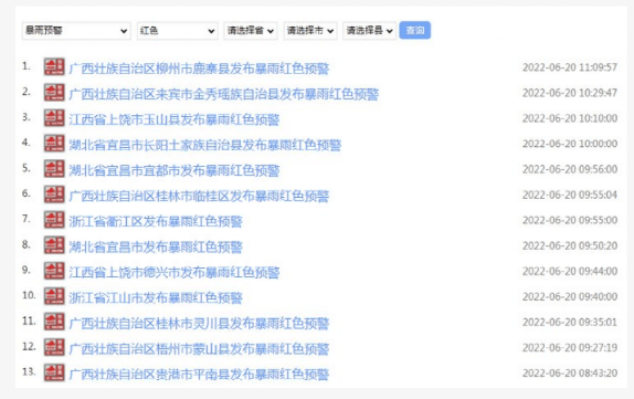 據水泥人網了解,20日浙江、廣西、江西、湖北等多地發布暴雨紅色預警。圖片