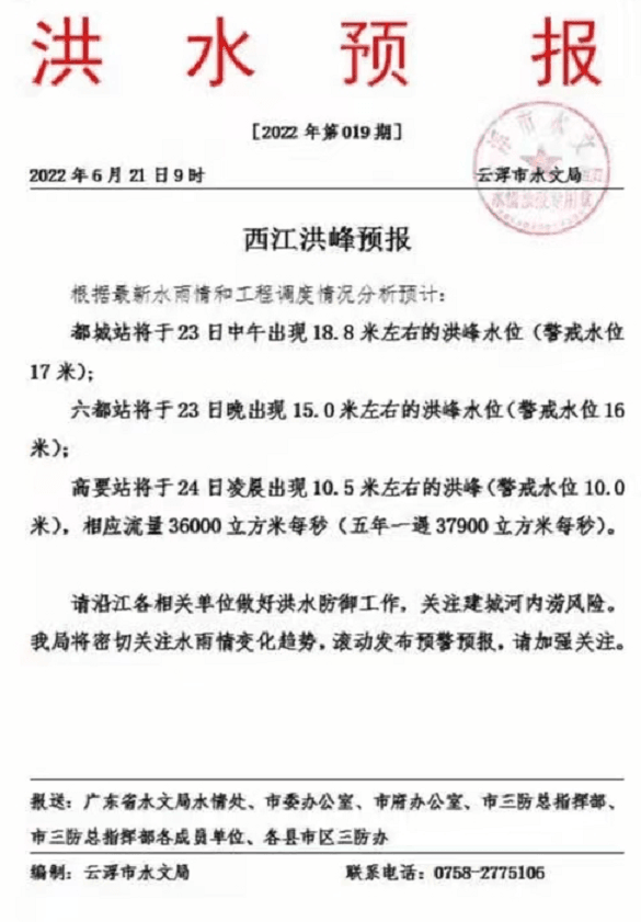 云浮市水文局發《洪水預報》稱, 根據最新水雨情和工程調度情況分析預計:都城站將于23日中午出現188米左右的洪峰水位(警戒水位17米);六都站將于23日晚出現150米左右的洪峰水位(警戒水位16米);高要站將于24日凌晨出現105米左右的洪峰(警戒水位10.0米),相應流量36000立方米每秒(五年一遇37900立方米每秒)。請沿江各相關單位做好洪水防御工作,關注建城河內澇風險。