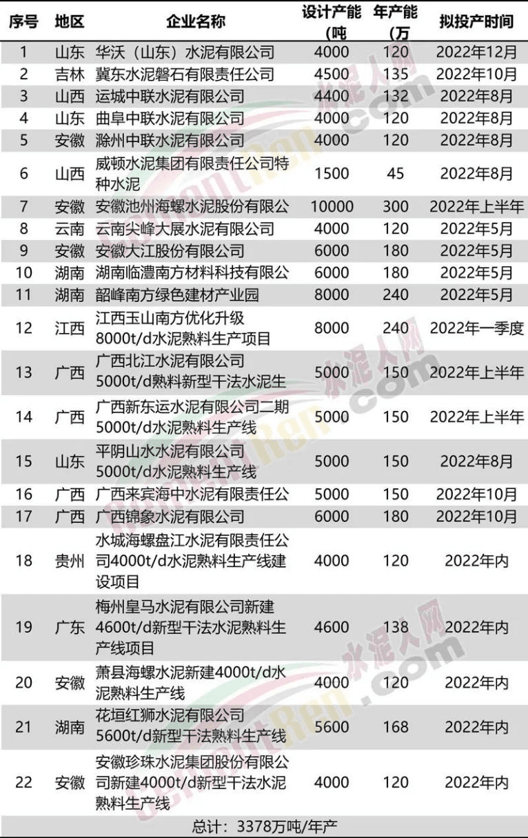 據水泥人網此前消息,原計劃于今年內投產的22條熟料生產線項,目前已點火和已開建,且明確今年內點火投產的項目共11條線分別為:1 江西玉山南方8000t/d水泥熟料生產線于2020年12月23日開工,原計劃于今年一季度點火投產。目前熟料項目已經達產,日產量在9800-10200噸,道路和綠化是還在施工中;2 廣西新東運水泥5000t/d水泥熟料生產線,已點火;3 韶峰南方8000t/d水泥熟料生產線,已點火;4 廣西錦象水泥6000t/d水泥熟料生產線一線暫定7月8日點火投產,二線暫定下半年點火投產;5 廣西都安上峰水泥一線5000t/d熟料生產線計劃于7月投產;6 平陰山水水泥5000t/d水泥熟料生產線,計劃于8月點火;7 池州海螺10000t/d水泥熟料生產線,計劃于8月點火投產;8 廣西北江水泥5000t/d水泥熟料生產線,原計劃上半年投產,目前仍處于建設和設備調試中。上周內回轉窯筒體吊裝合攏,預計于今年下半年內點火投產;9 水城海螺盤江水泥4000t/d水泥熟料生產線已開工建設,原計劃于2022年底前點火投產;10 安徽珍珠水泥4000t/d水泥熟料生產線已開工建設,原計劃于今年內點火投產。