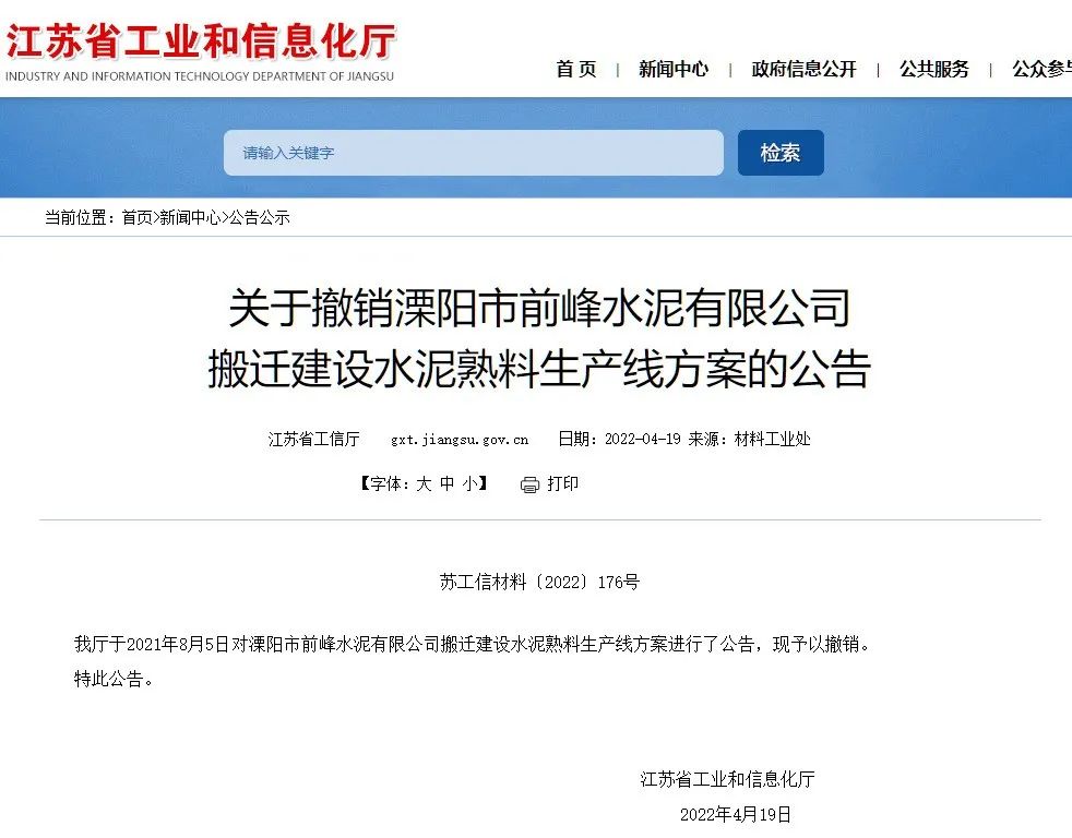 今年4月19日,江蘇省工信廳發(fā)布公告稱,撤銷2021年8月5日發(fā)布的《溧陽市前峰水泥有限公司搬遷建設(shè)水泥熟料生產(chǎn)線方案公告》。