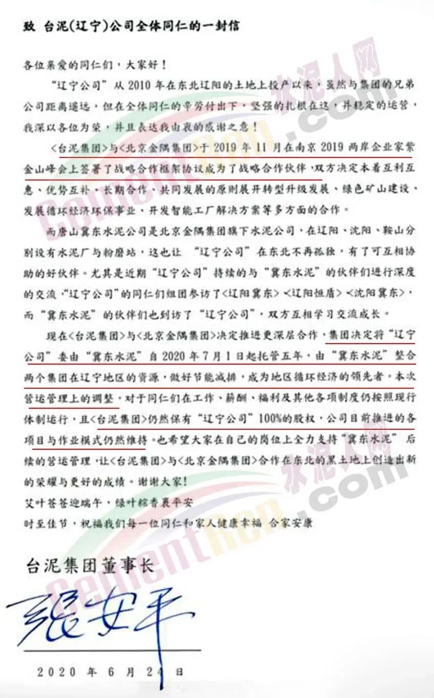 據(jù)水泥人網(wǎng)此前報道,2020年6月臺泥集團董事長張安平先生在發(fā)給臺泥(遼寧)公司全體員工的一封公開信中稱:臺泥集團與北京金隅集團于2019年11月在“南京2019兩岸企業(yè)家紫金山峰會”上簽署了戰(zhàn)略合作框架協(xié)議,成為了戰(zhàn)略合作伙伴。