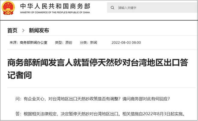 自佩洛西竄訪后,中國進行了雷霆反制。據商務部網站消息,商務部新聞發言人就暫停天然砂對臺灣地區出口答記者問。商務部新聞發言人表示,根據相關法律規定,決定暫停天然砂對臺灣地區出口,相關措施自2022年8月3日起實施。