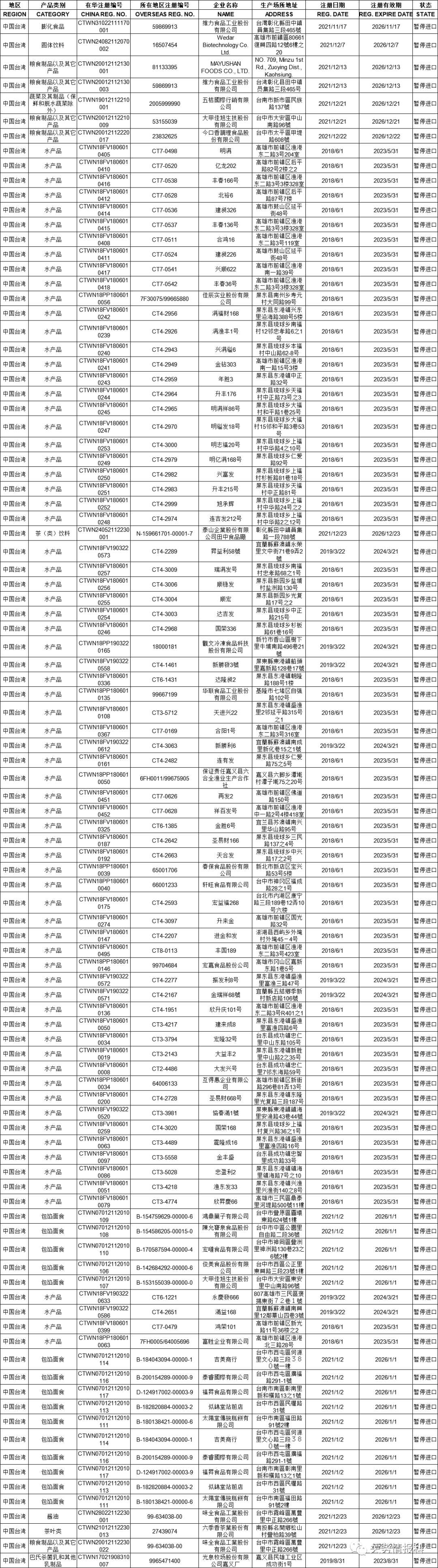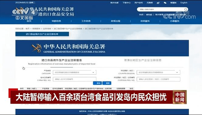 在海關總署官網港澳臺地區生產企業注冊信息頁面上查詢臺灣生產商資料,有部分企業的狀態欄已顯示“暫停進口”,其中包括維力食品、郭元益食品、味全食品、泰山、維格餅家等。據悉,這是依據海關總署第248號令《中華人民共和國進口食品境外生產企業注冊管理規定》,限制未完成更新注冊的臺灣廠商產品輸往大陸。