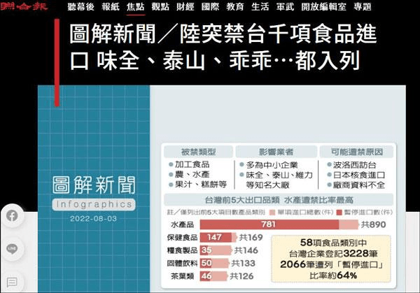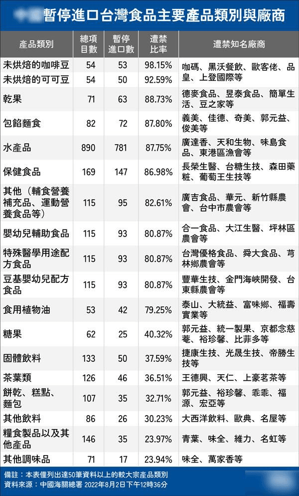 消息顯示,8月1日晚,海關總署就宣布暫停對中國臺灣地區的100多家食品進口,隨后清單又進一步擴大,自8月3日起暫停進口中國臺灣地區的檸檬、葡萄柚等柑橘類水果以及冰鮮白帶魚、凍竹莢魚等水產品。